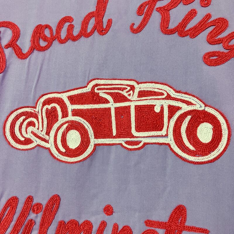 背中はヴィンテージのカークラブジャケットの柄をサンプリングした「ROAD KINGS」柄で、古き良きモーターカルチャーを感じさせるデザイン。